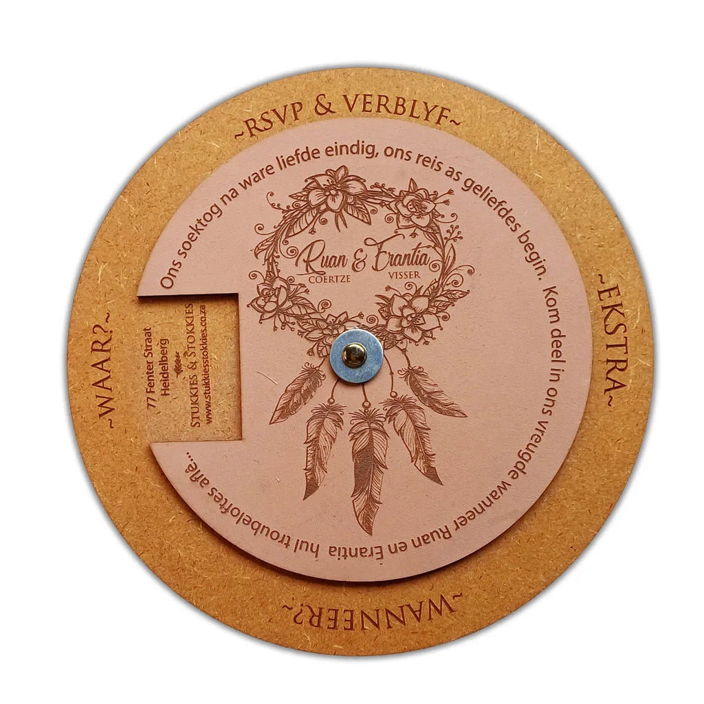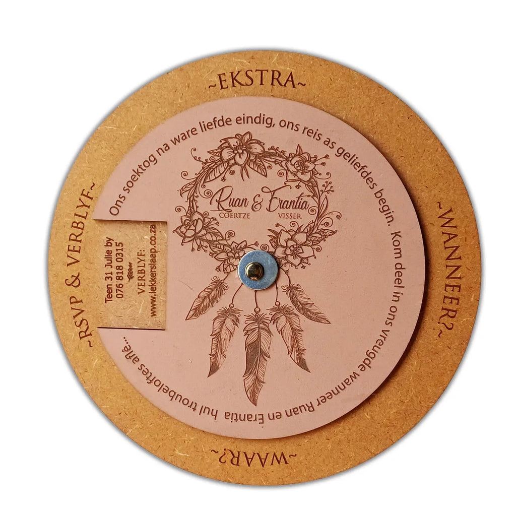 Introducing the Laser-Cut Wooden Rotatable Circle Wedding Invitation from Forevermore Momentos, where every detail is crafted with precision and love. This unique rotatable wedding invitation adds a touch of elegance and novelty to your special day.